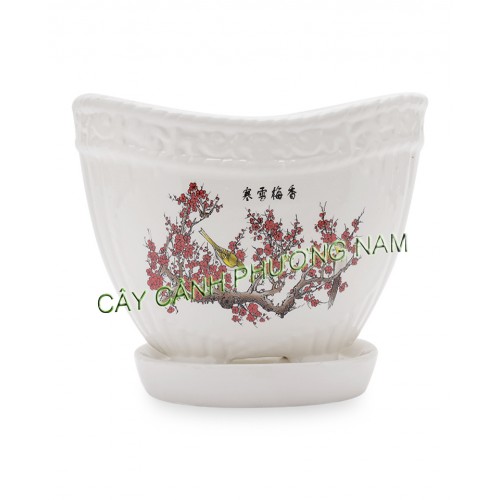 - Chậu có kiểu dáng oval với đĩa lót tiện lợi cùng các họa tiết hình hoa đào đẹp mắt độc đáo, màu sắc sang trọng, tinh tế sẽ tạo nét thẩm mỹ cho không gian sống nhà bạn.
