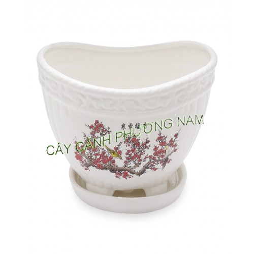 - Chậu có kiểu dáng oval với đĩa lót tiện lợi cùng các họa tiết hình hoa đào đẹp mắt độc đáo, màu sắc sang trọng, tinh tế sẽ tạo nét thẩm mỹ cho không gian sống nhà bạn.