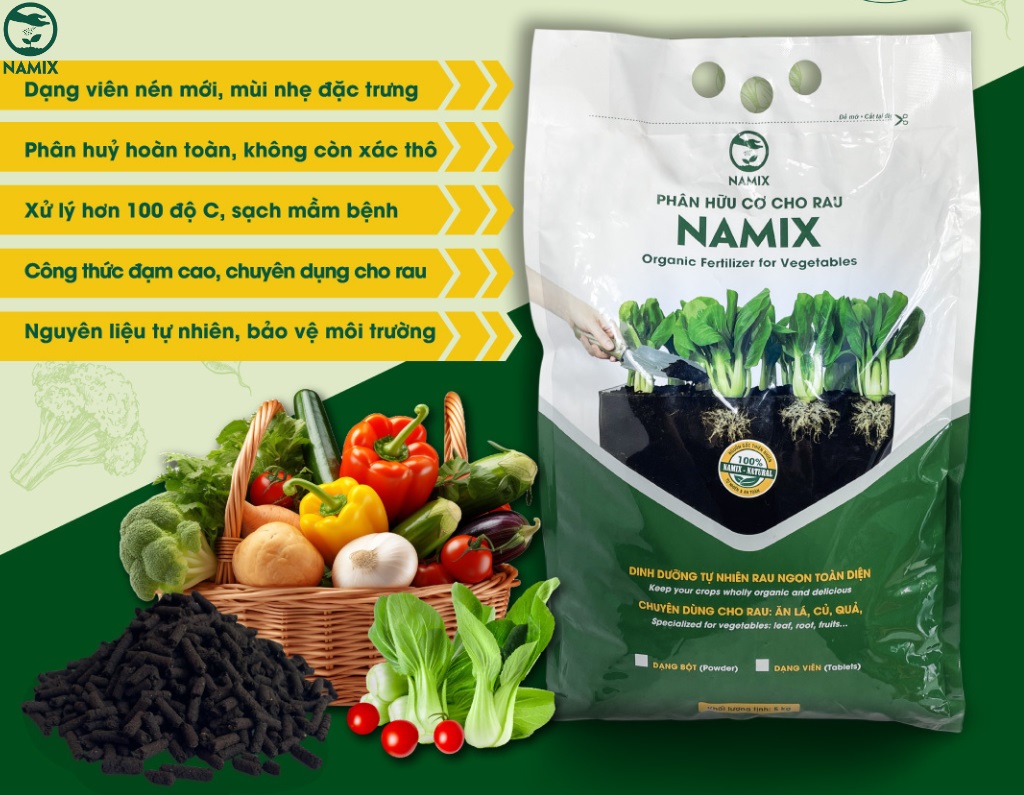 Phân hữu cơ cho rau NAMIX chuyên dùng cho rau ăn lá, củ, quả,… và các cây trồng khác ở giai đoạn phát triển thân, cành, lá (giai đoạn sinh trưởng sinh dưỡng). Thành phần chính: