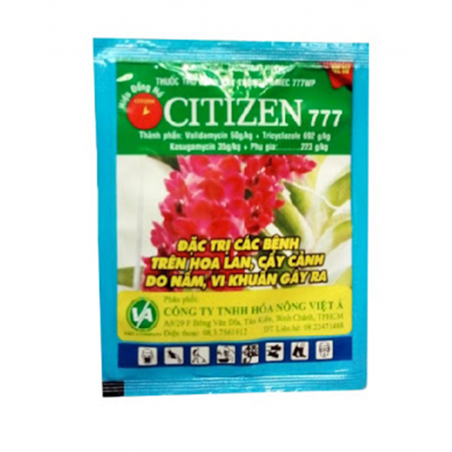 Mô tả: Thuốc trị bệnh cho cây trồng citizen 777 có hiệu lực nội hấp kéo dài, bám dính cao và chống rửa tổi. Sản phẩm được dùng để trị các bệnh do vị khuẩn, nấm gây ra như: đốm vòng, đốm nâu, thối nhũn, vàng lá. Nhất là trên các loại cây phong lan.